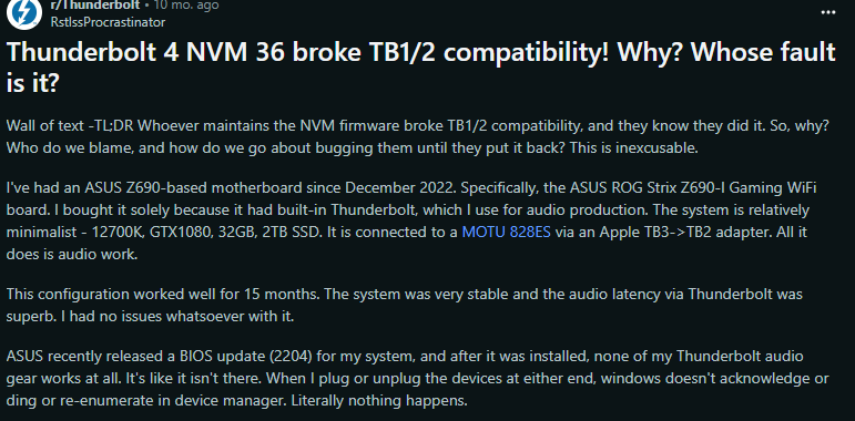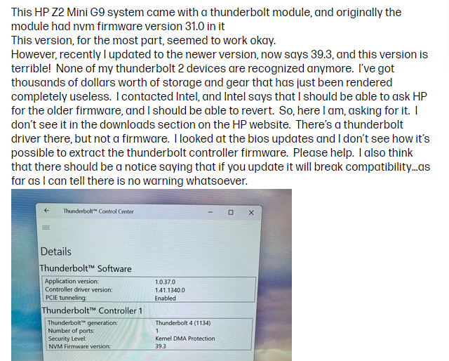 원인은 썬더볼트 컨트롤러의 NVM 펌웨어 문제로, 최신 바이오스들에는 NVM 펌웨어 버전이 32.0으로 업데이트 되어 있었고, 31 이후 버전에서는 아래와 같이 썬더볼트 기기가 정상적으로 작동하지 않는 사례들이 발생했으며,