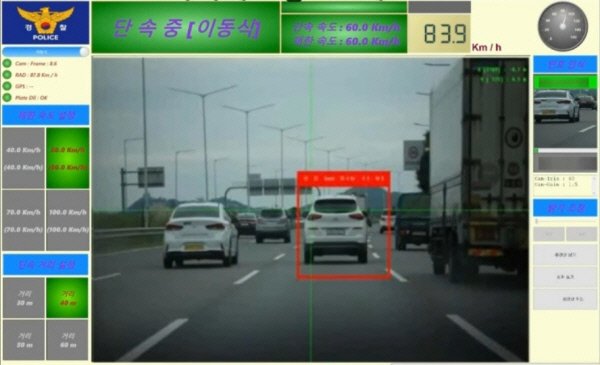 먼저, 울산경찰청이 보도한 단속 장비 UI를 보면, 이와 같은 형식을 가진 것으로 보입니다. 차내 탑재 디스플레이에 표기되는 화면으로, 위반 차량과 함께 속도를 표기해 주는 것처럼 보입니다.